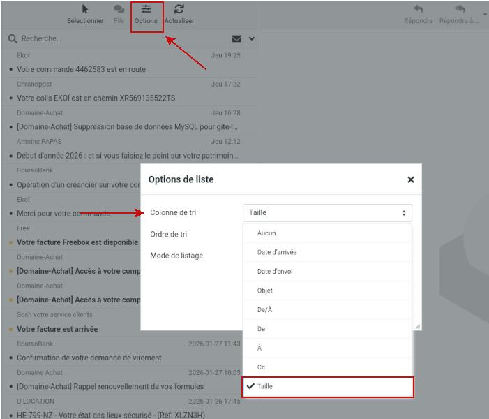 - Ordre de tri : Descendant (afficher les mails du plus lourd ou mois lourd)