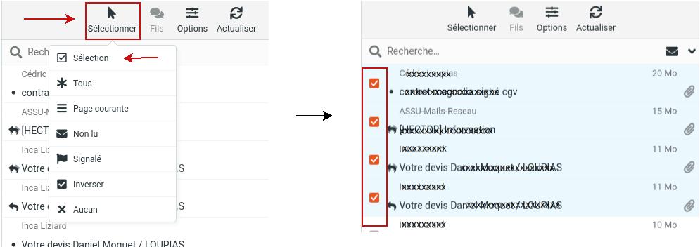 Une fois le contrôle ci dessus effectué, sélectionnez les 20 premiers emails de votre liste (voir plus si nécéssaire) en cliquant sur "Sélectionner" (puis "Sélection") puis en cochant vos emails.
